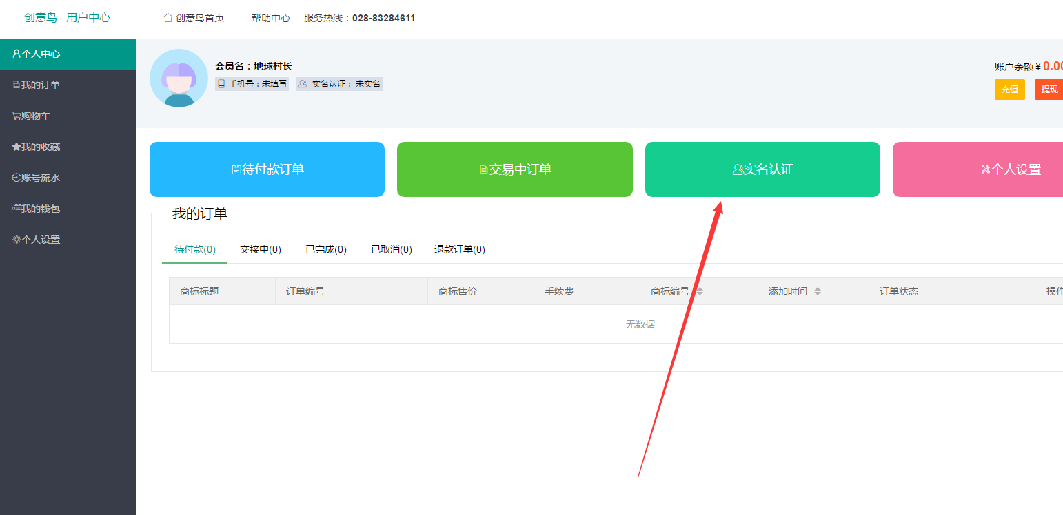 第二步:登陆注册的会员账号打开个人中心点击实名认证进行提交认证